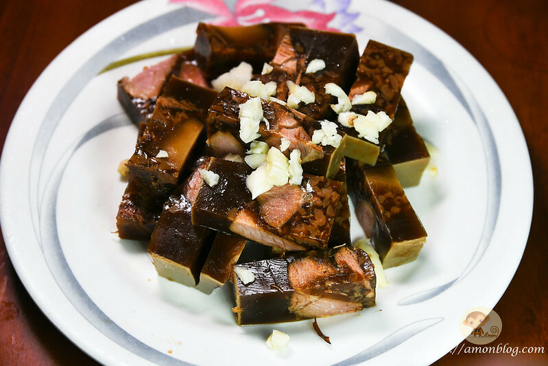 一開始以為是凍豬腳之類,但上桌後發現跟想像中不一樣,而是比較類似台灣冷盤上的肉凍,用豬後腿肉與豬皮熬出的膠質做成肉凍,將食材再利用的淋漓盡致上桌前有先冰鎮過,所以吃起來會有果凍感和沁涼感,口感很多層次,搭配蒜頭一起吃更好吃,這肉凍並隨著時間而慢慢溶化,所以記得要先吃這個,不然溶化後口感就沒那麼好。