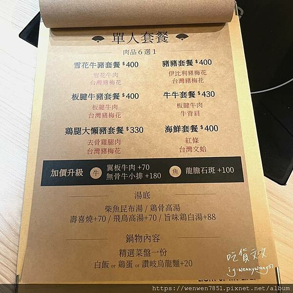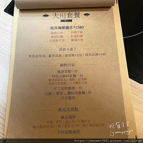 雙人套餐有「煙花套餐」「大川套餐」「太鼓套餐」「水炊鍋」,