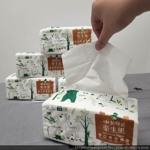所以現在我公公去家樂福的時候我都會推坑他用這款家樂福抽取式花紋衛生紙FSC,