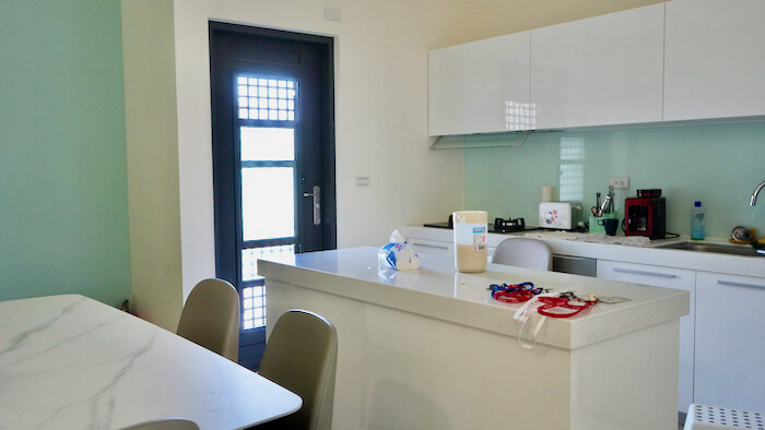 民宿裡面也有提供廚房,包棟想要自己煮火鍋也可以,大力稱讚廚房真的太乾淨了,果然是全新開幕的民宿,白色的廚房看起來乾淨溜溜!