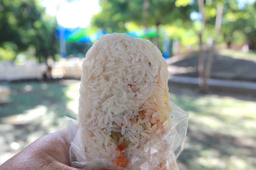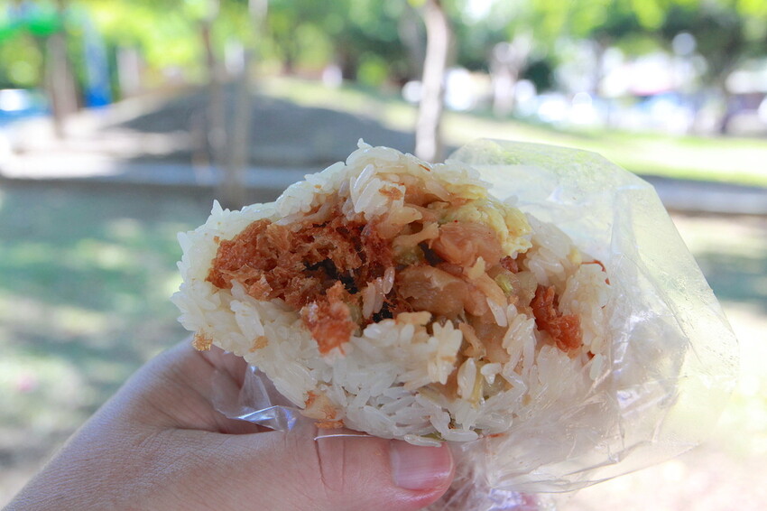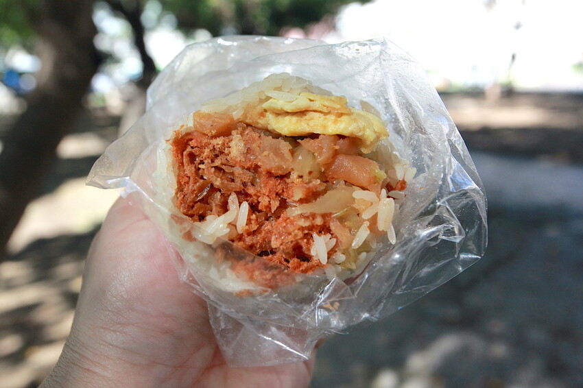 這飯糰主要以糯米為主比較有嚼勁,裡面包覆著但、油條、辣蘿蔔、肉鬆及豆枝等食材。