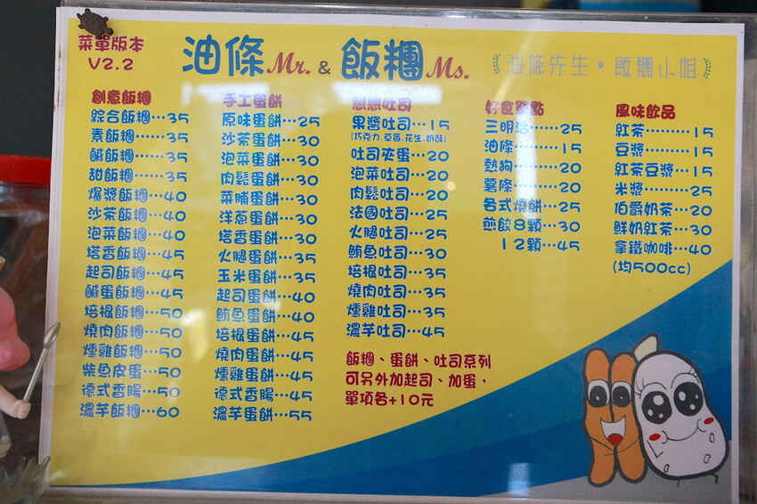 這張護貝菜單供客人點餐參考,菜單主要分類有創意飯糰類、手工蛋餅類、戀戀吐司類、單品類及飲品類供選擇。