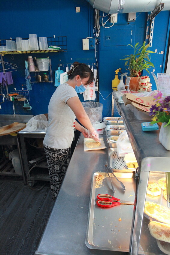 室內料理台檯面上有各種燒餅供選擇,料理台前方有寫上各種菜單供參考。