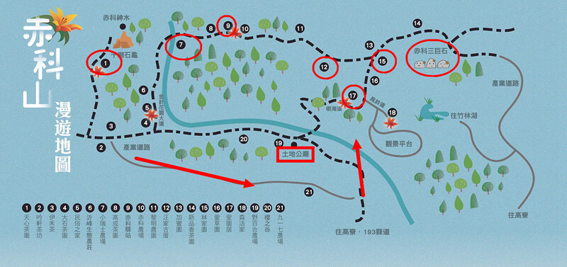 上到赤科山後會在土地公廟處,有南北兩方向的道路,再依指示方向下山就可以( 上山與下山道路是錯開的)
