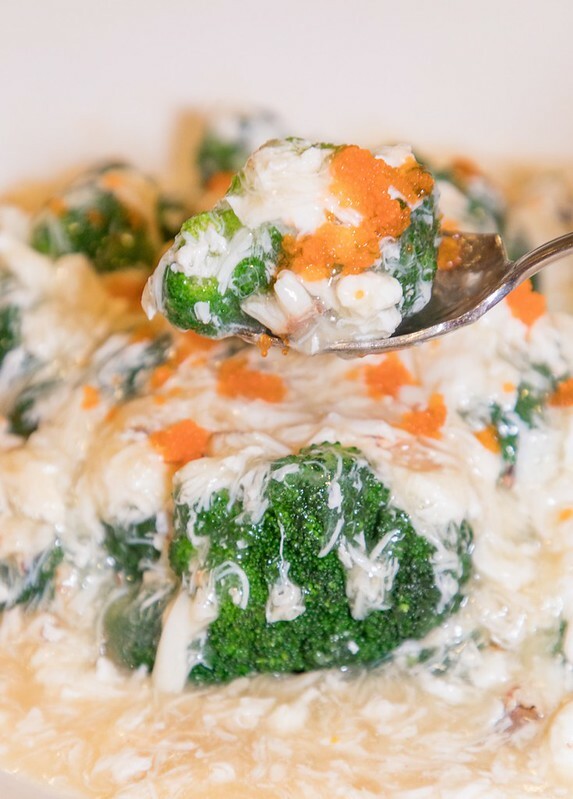 貴妃鮮蟹扒時蔬,入口時那領頭的酒香十分迷人,口感端有一點像賽螃蟹和魚羹的綜合口感,蟹肉絲用得不少,鮮甜度很足,灑上的蟹卵添色也增味。