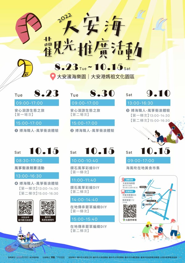 今年度的「大安海觀光推廣活動」從以往為期兩天的活動改成分梯次的活動形式,從8月開始到10月,讓更多民眾可以挑選日期參加博海職人風箏衝浪體驗、洄游生態之旅,以及適合親子互動的風箏彩繪、藺草編織DIY,有一種夏令營的感覺,10/15最後一天還有熱鬧的風箏衝浪競賽要登場,非常歡迎民眾前來參與盛宴一同感受10月秋季的大安海魅力~