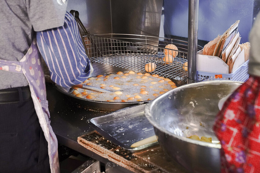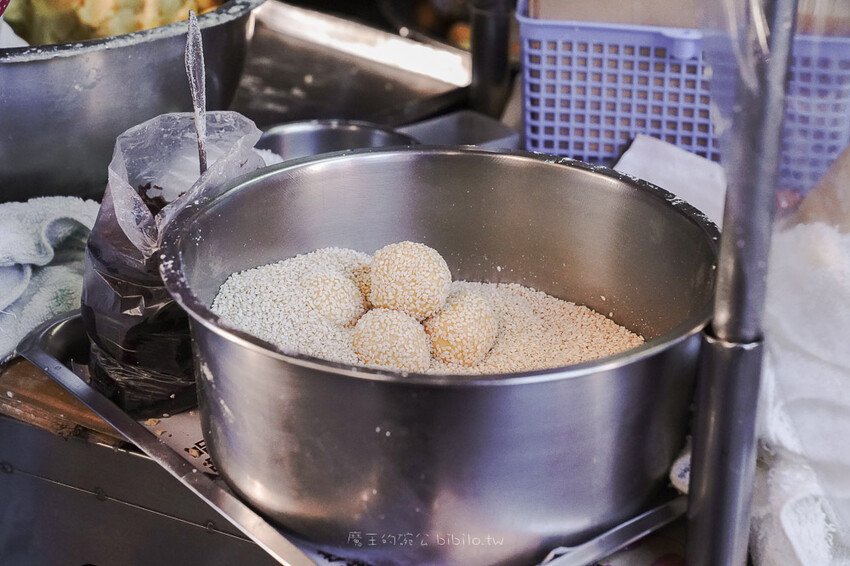 小小攤車是一對老夫妻在賣,阿姨負責備料,分裝,結帳,阿北負責炸QQ球跟部分備料,我看了一下,QQ球都是以一鍋一鍋出鍋完後才會製作下一鍋,我想也是要讓大家吃到熱熱現炸的QQ球,然後阿姨會叫號,喊到你,就上前跟阿姨說你要多少元的QQ球跟芝麻球,網路上說老夫妻不愛人家拍照,臉色會很臭,我當天小心翼翼的拍照深怕被罵,結果人家只是真的很忙,臉部表情很正經而已,哈哈哈,拍照可以拍,但不要去干擾他們作業就可以。