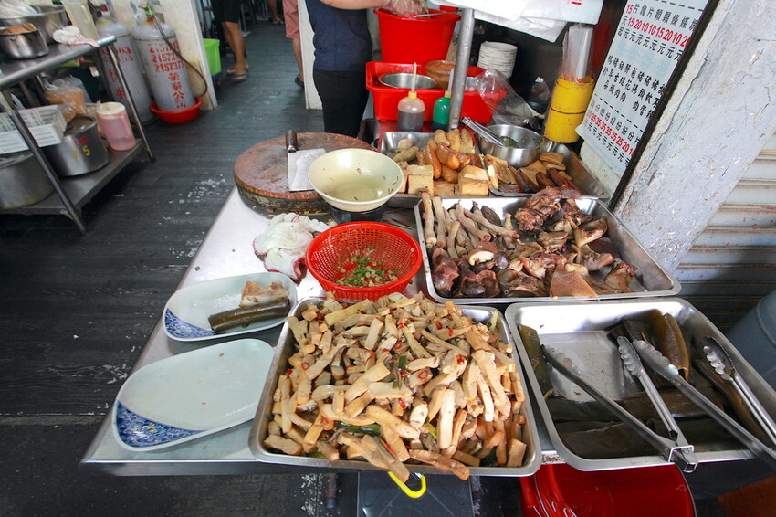 檯面上擺滿各種滷味供顧客自行夾取。