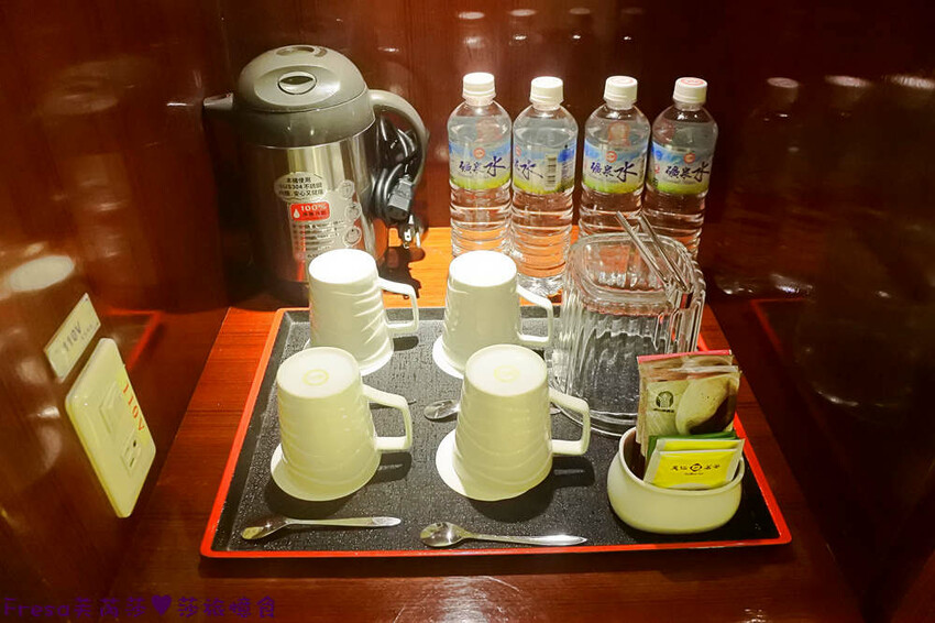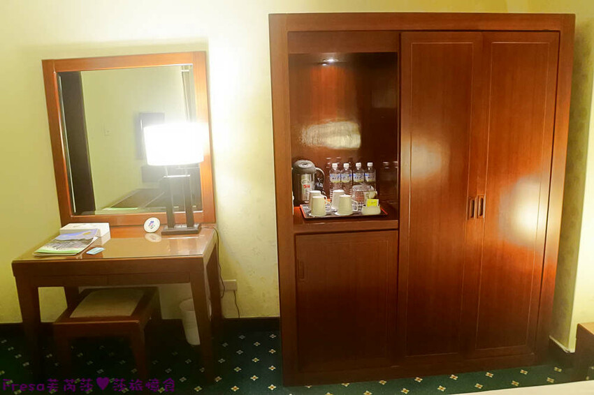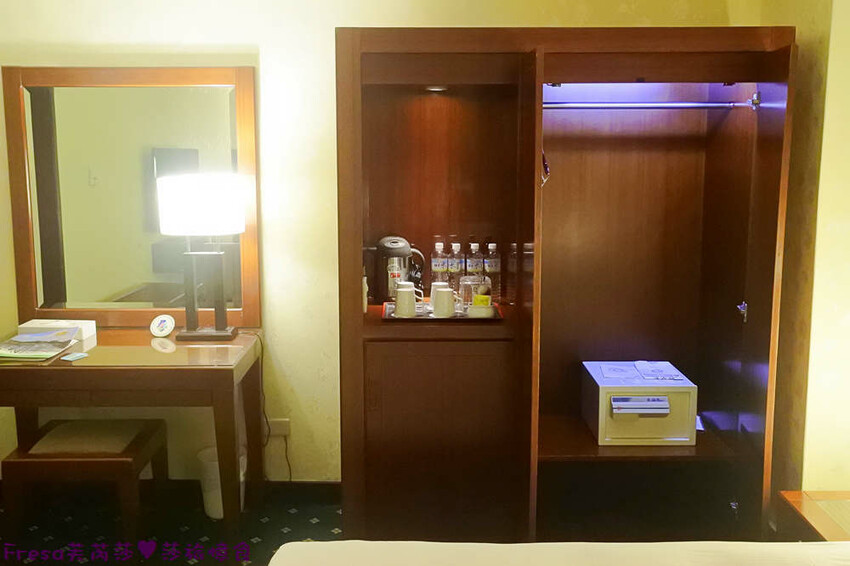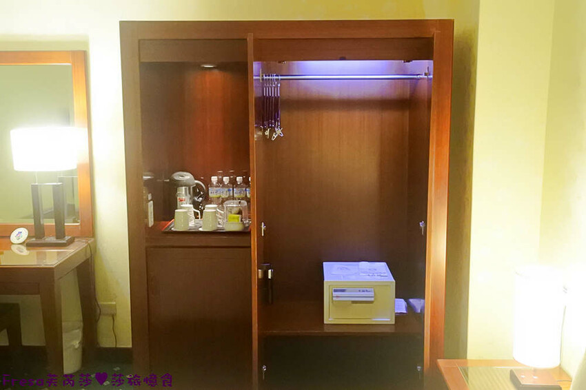 衣櫃內有保險櫃,吊衣區,迷你吧有瓶裝水和茶包咖啡包.