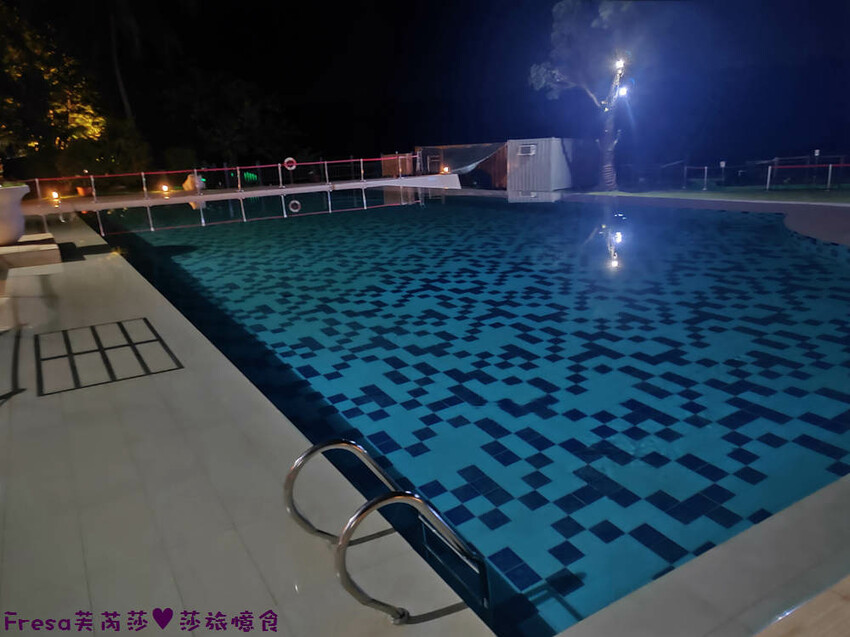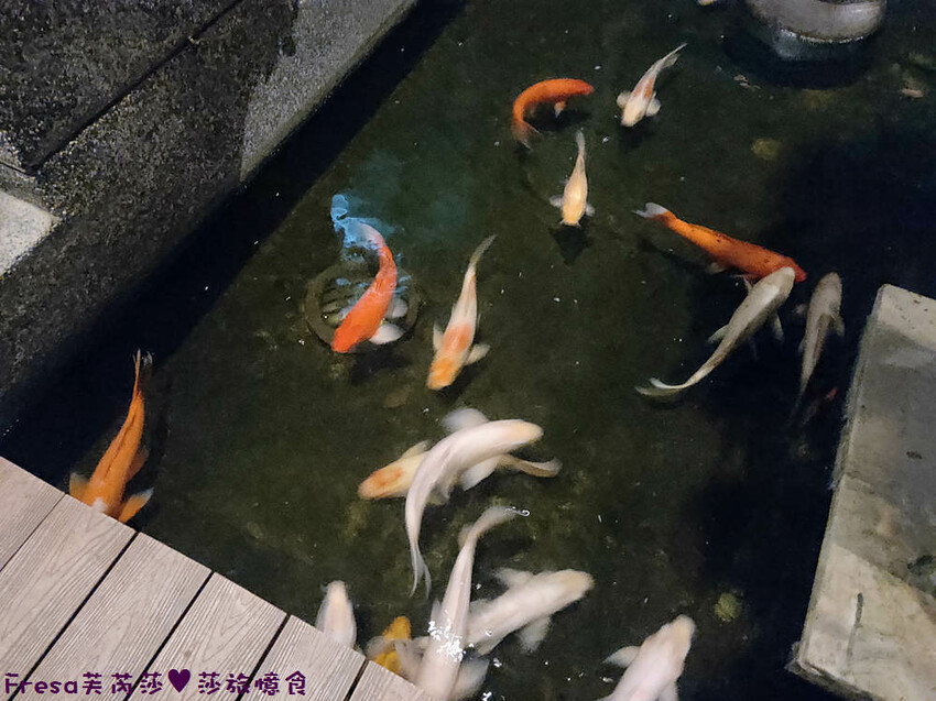 夜晚涼風吹來很舒服,池子裡很多小魚,可以櫃台購買魚料餵食哦!