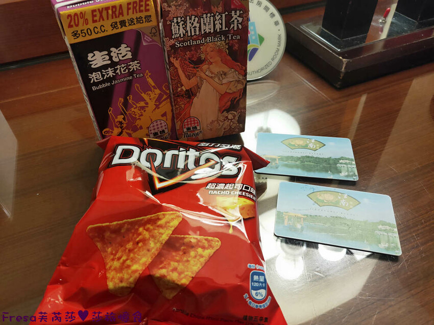 我們投了多力多滋和紅茶、花茶回到房間享用!