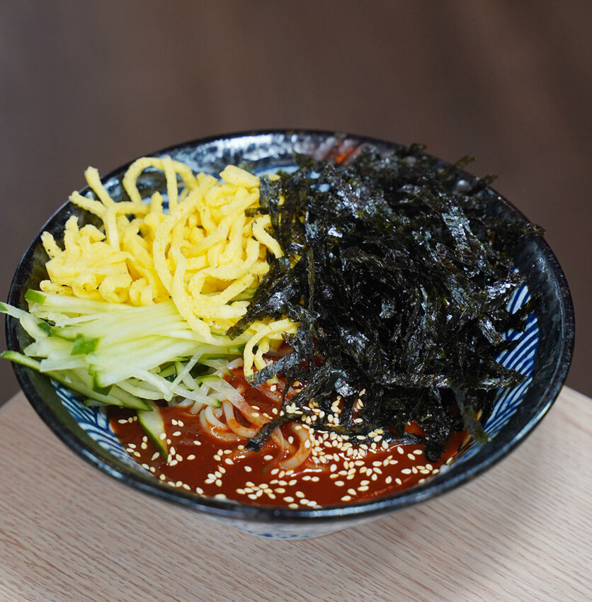 好吃推薦香醇好吃韓式冷拌麵,使用正宗韓國麵條,加入小黃瓜、蛋絲、海苔
