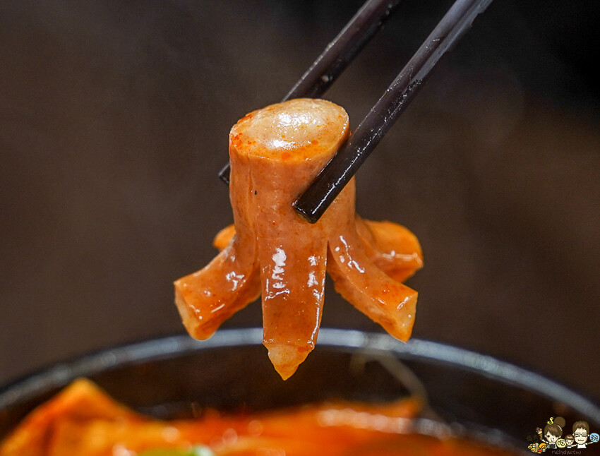 鑫鑫腸像是小章魚的造型,整個滲入韓式湯頭香辣度,咬下帶出鹹香滋味