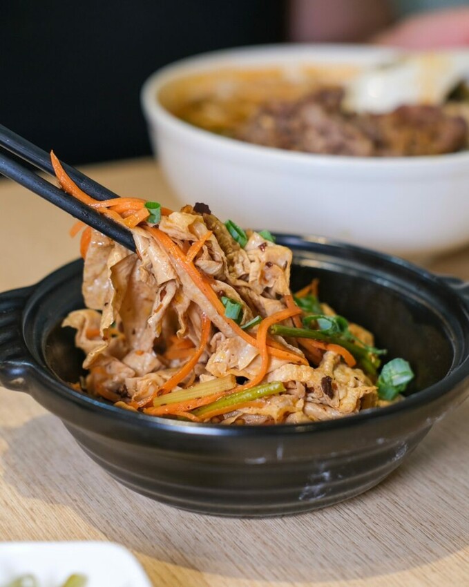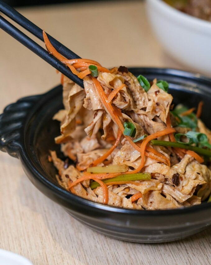 ▼以特製的醋香淋醬調味,拌著豆皮、蔥段、蘿蔔和芹菜,爽脆中帶有柔軟口感,是一道很開胃的菜色!