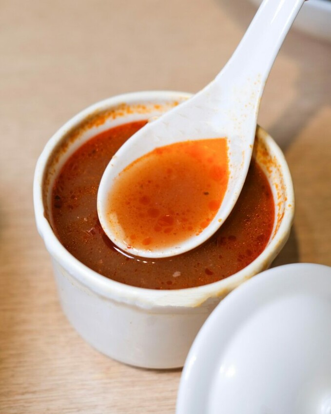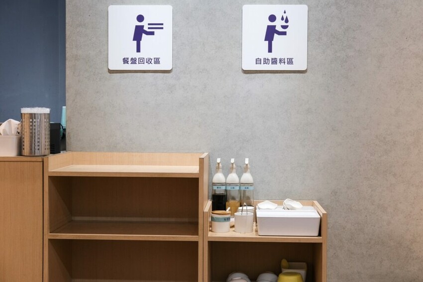 ▼【墨竹亭】採取自助用餐模式,醬料區提供白醋、醬油、烏醋、香油,還有秘製辣醬供使用,推薦嗜辣控可以試試秘製辣醬,辣度蠻厲害的很過癮,另外用完餐後須將餐盤放置回收區呦~