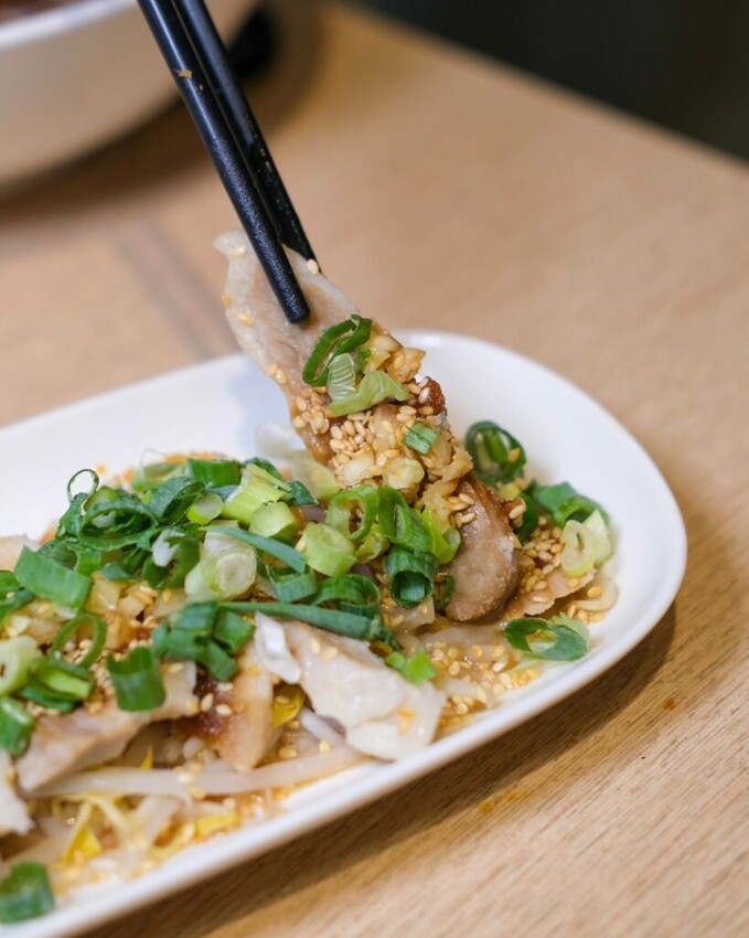 ▼蒜蓉霜降豚將切成薄片狀的嚴選豬肉,撒上特製的香蒜醬及蔥段,彈牙肉質遇上濃郁蒜香,十分涮嘴。