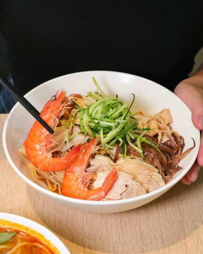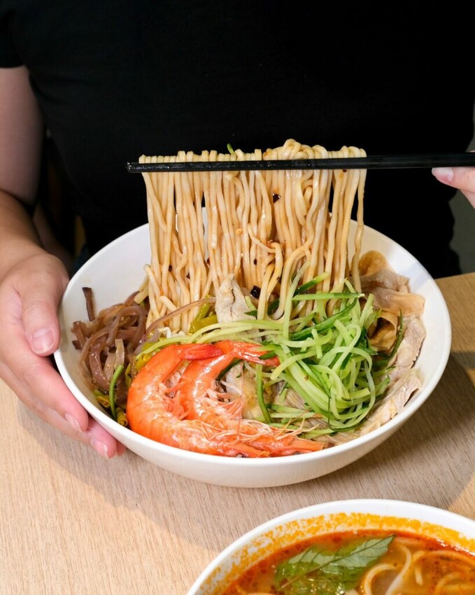 ▼配料豐盛的八仙過海,以招牌紅油燃麵為基底承載著鮮蝦、肉片、木耳和豆皮,再特別加入脆嫩的酸豇豆,吃起來的口感很豐富,以巴渝的獨門香料配方調味,一上桌就有花椒香撲鼻而來,香爽來勁卻不會膩口、死鹹,帶勁的辣度讓人十分過癮~