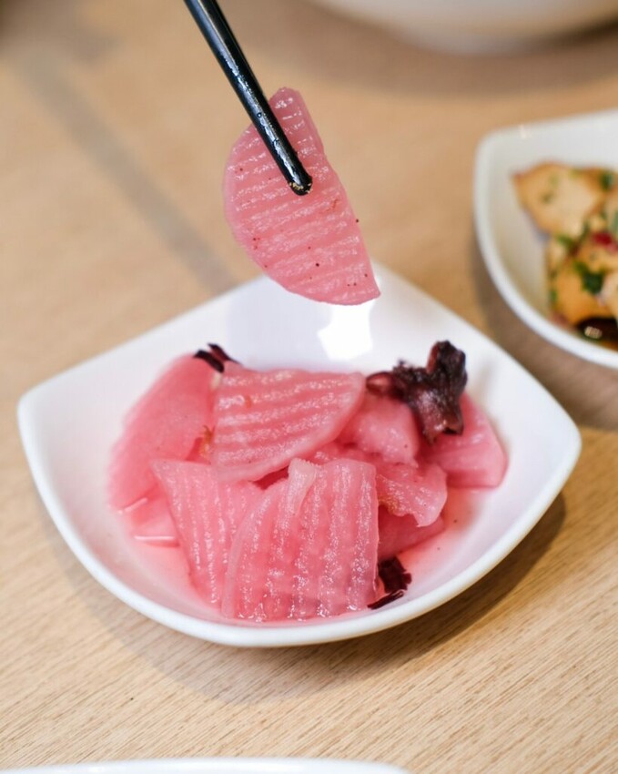 ▼每次來都會點的小菜就是花生米血 ,Q軟米血搭配花生的香氣,讓人一口口上癮;另外滷製入味的五香豆干,口感多汁,還有滿滿的青蔥及辣椒提香;另外新推出的櫻花蘿蔔,加入洛神花,酸中帶甜的風味很清爽,搭配重口味的麵食很對味~