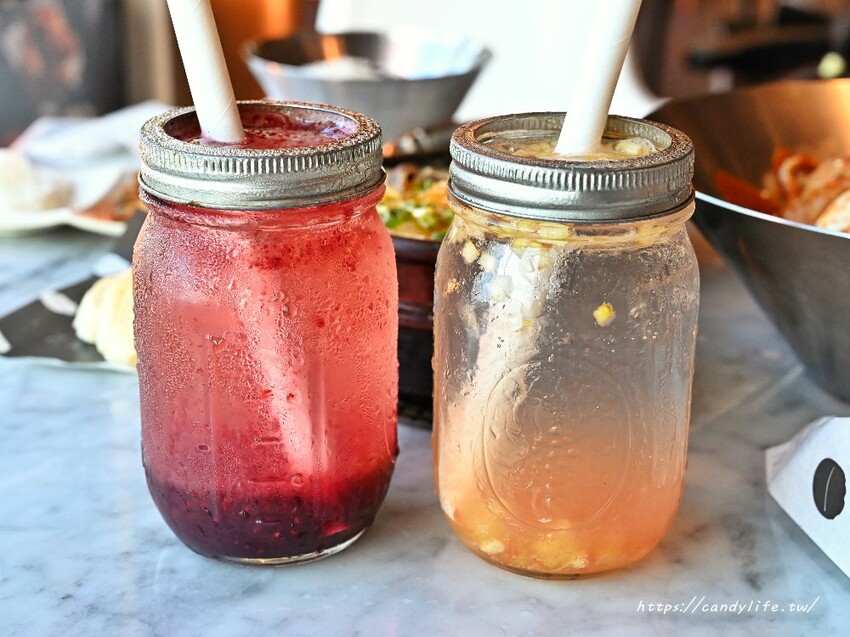 採用新鮮藍莓、覆盆莓及莓果醬下去打成果汁,搭配氣泡水,喝起來酸酸甜甜的,還可以吃到微微的莓果肉,另一杯蜜桃蘋果也相當清爽,裡頭還可以吃到香甜清脆的蘋果丁呢