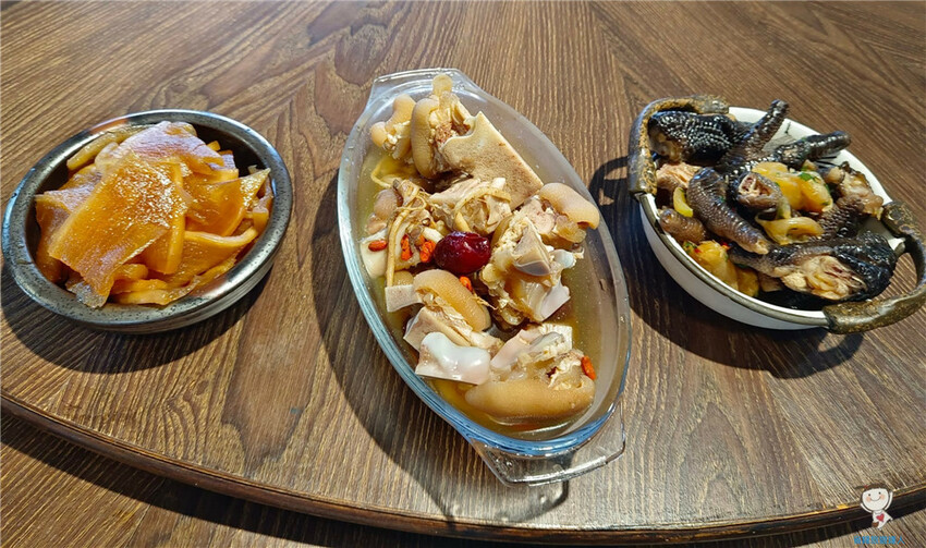 我們才一坐下,店家就招待了三碟小菜,分別是醃蘿蔔,醉元蹄和涼拌鳳爪