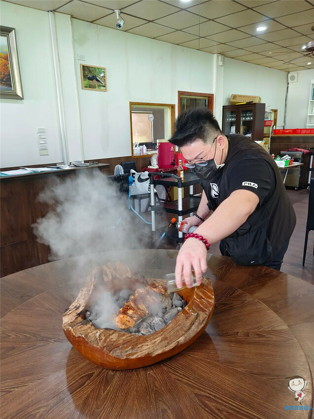 瞧瞧蒜味蝦著火的瞬間,再加上底下的鵝卵石等天然材料,是不是很有原住民料理的fu?