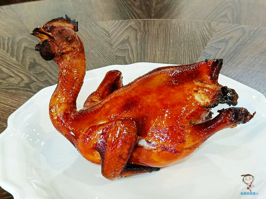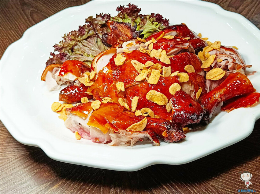 跟烤鴨一樣烤得油油亮亮的雞皮,也是讓人相當垂涎,灑上蒜片一起吃,味覺更有層次