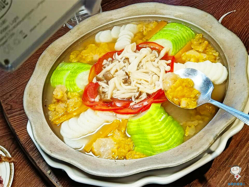 用上等瑤柱高湯精華做出來的田園蔬,包括絲瓜,荸薺,番茄和菇類