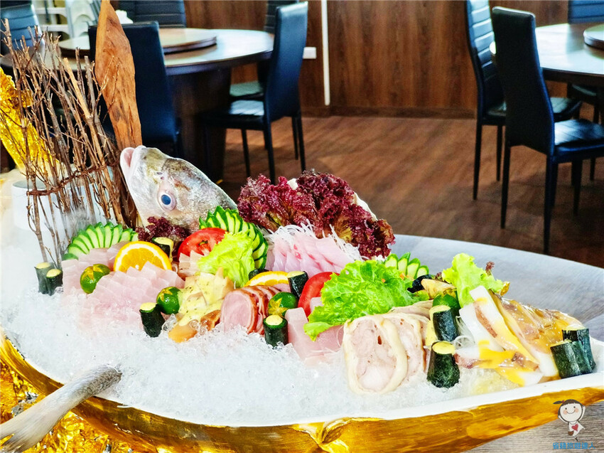 乾冰散去後就能看到一整船華麗的沙西米,包括鮭魚,鮪魚,旗魚,透抽和水晶蹄膀等