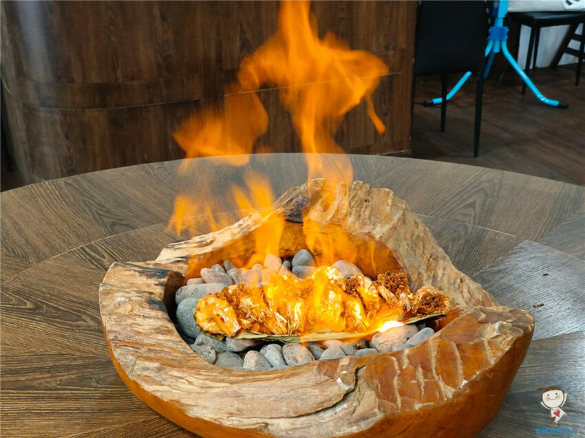 這道火焰風味蒜味蝦也是噱頭十足,用裝滿鵝卵石的木頭基座當容器