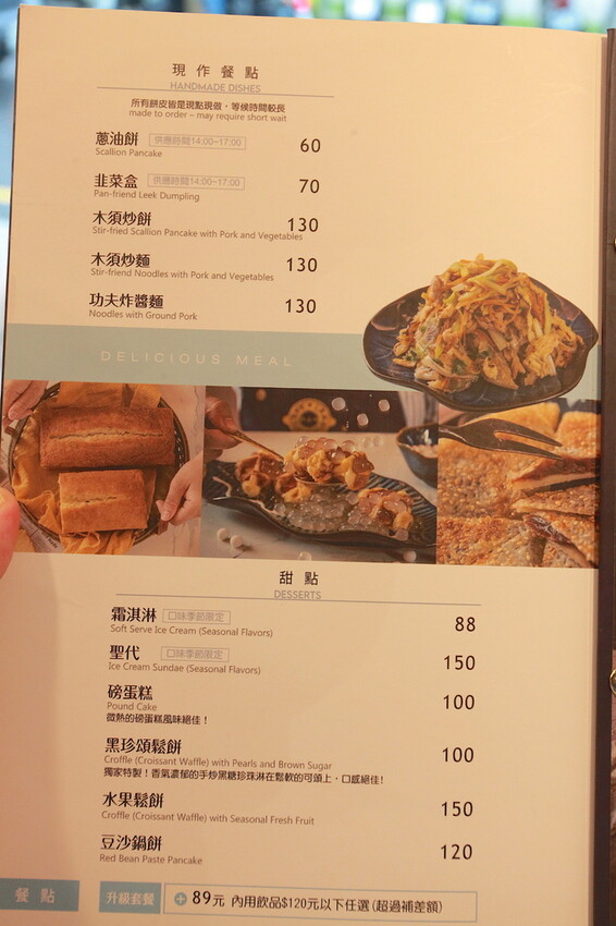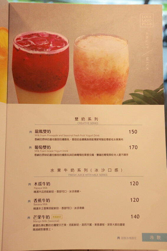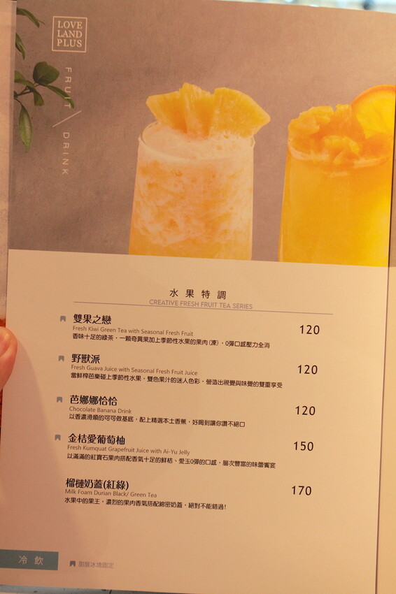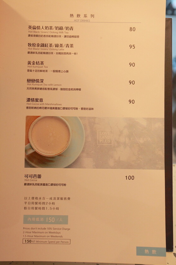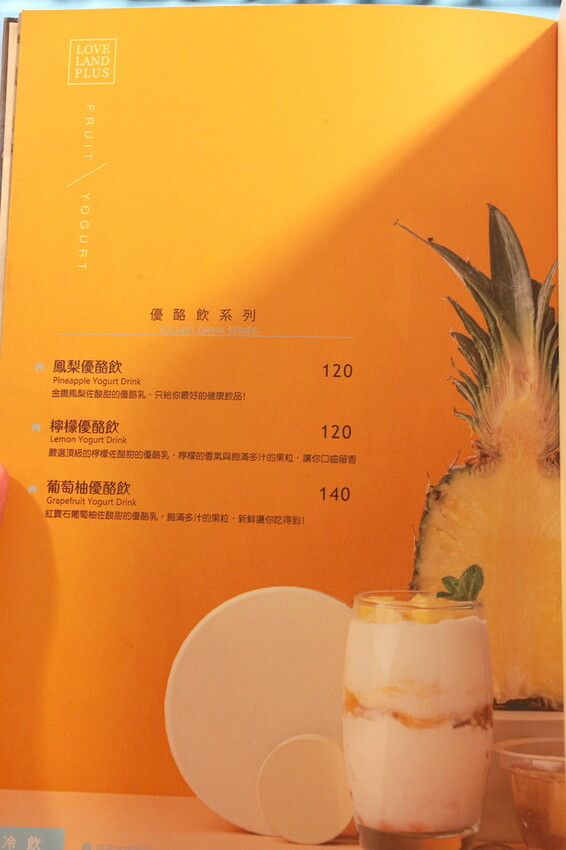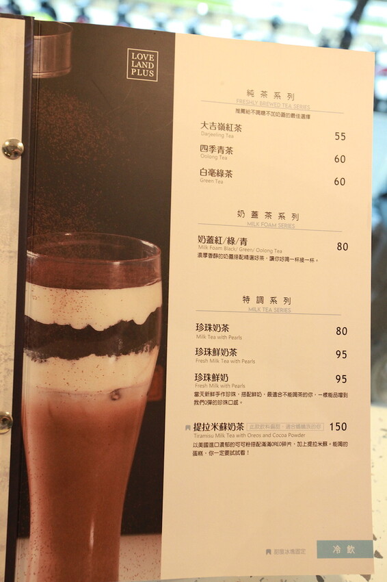 這本是製作精美菜單供顧客點餐參考,菜單主要有純茶系列、奶蓋茶系列、特調系列、水果特調系列、霜奶系列、水果牛奶系列、優格飲系列、熱飲系列、現做點心系列及甜點等,比較獨特還有賣麵食類當主食,需要額外收取10%服務費。
