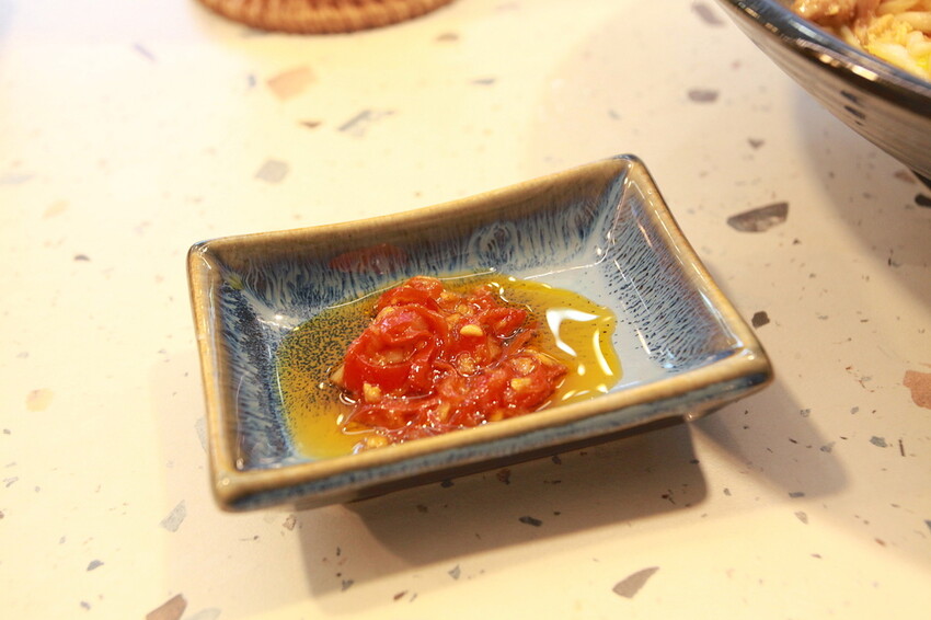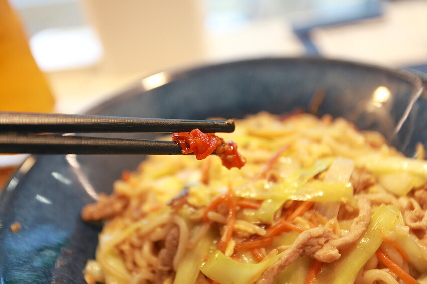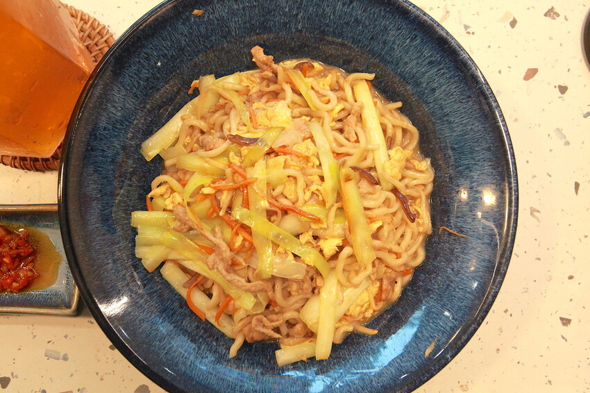 這炒麵有放上ㄧ諜辣椒醬供沾食。