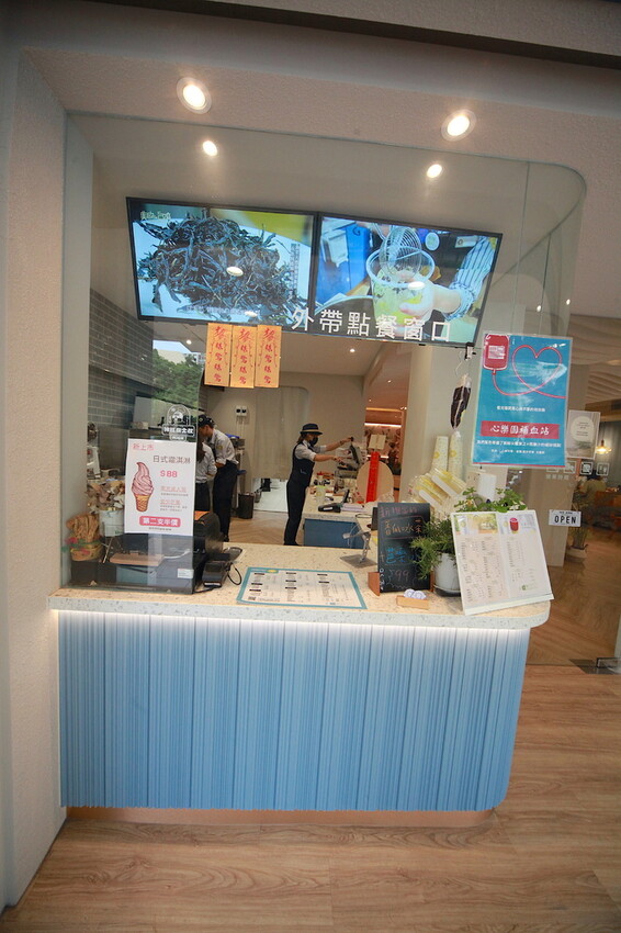 門面設計有對外銷售櫃檯來服務顧客,蒂芙尼藍櫃檯上面放置菜單供參考。