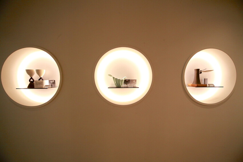 牆面有製作圓形玻璃展示櫃,裡面放置很有造型茶具供欣賞。