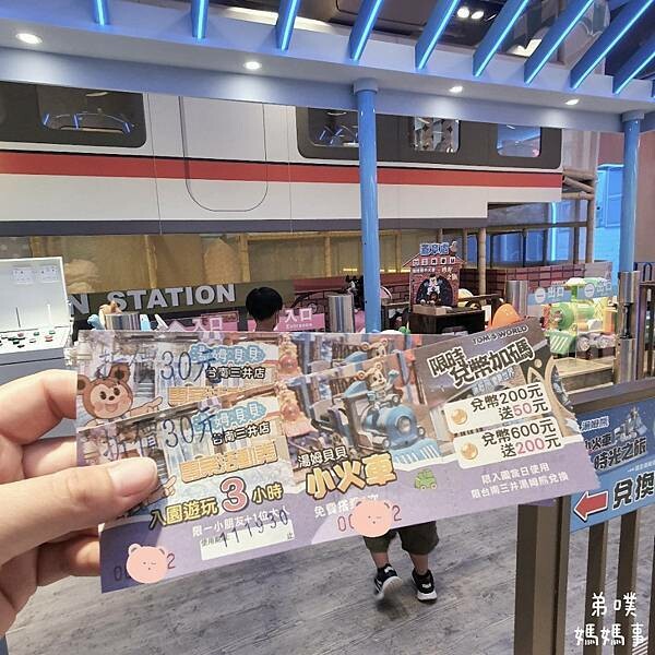 最重要的是五個章蓋完要去湯姆熊還能坐免費小火車! 先拿護照到櫃台換卷子,有湯姆貝貝優惠卷、免費小火車搭乘、和代幣兌換優惠