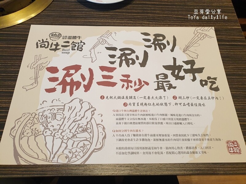 ▲餐紙上面有食用教學:涮三秒最好吃!