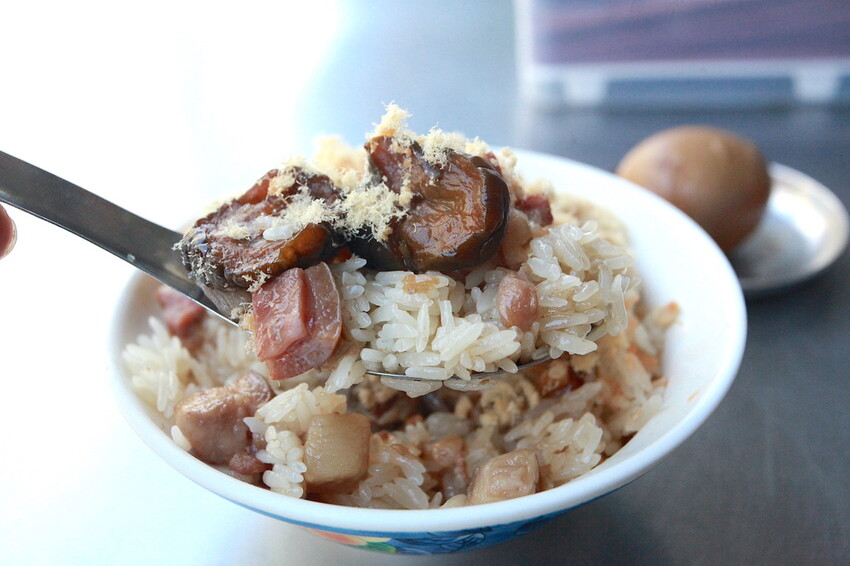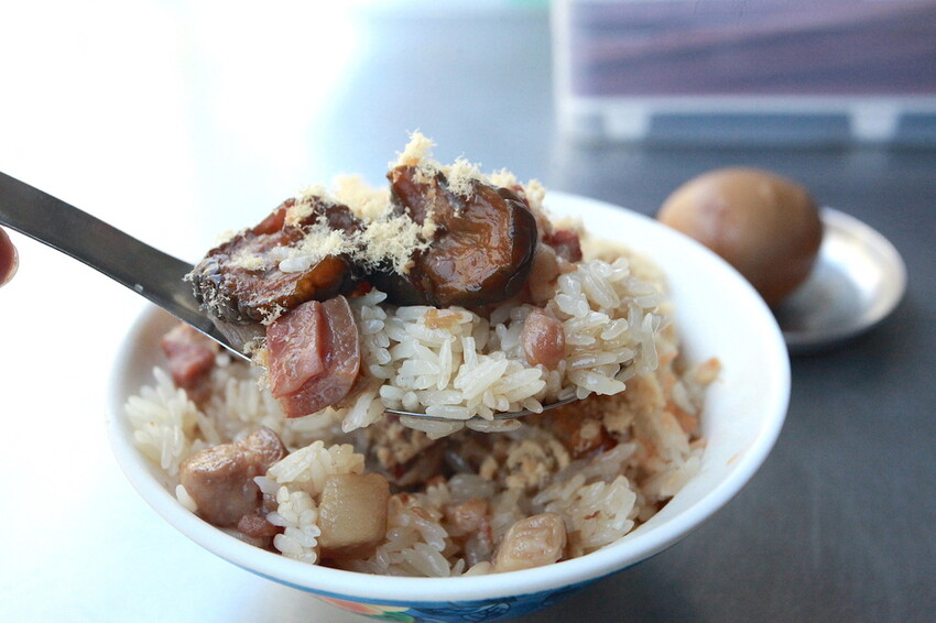 這米糕表面有肉丁、黑瓜及魚酥等配料,米糕再淋上自製肉燥來提味。