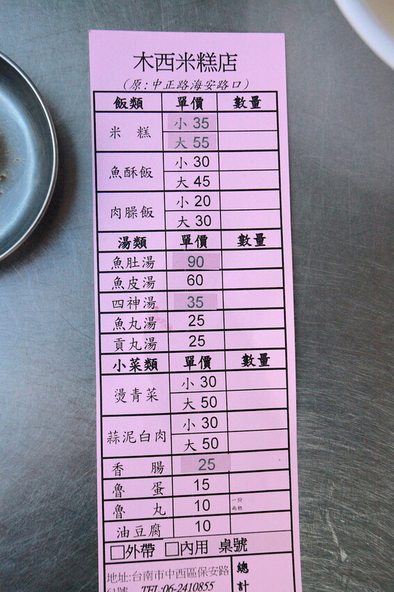 這家「木西米糕店」也是超過50年老字號店家,店面原本在海安路與中正路口,因海安路地下停車場工程施工, 才搬遷至保安路現址繼續營業,小高以前來吃阿鳳浮水魚糕,也會順便點木西的米糕來享用 ,品嚐完覺得米糕最大敗筆在肉燥,這肉燥偏甜肉燥鹹香度不足,整體口感中規中矩且定價合理。