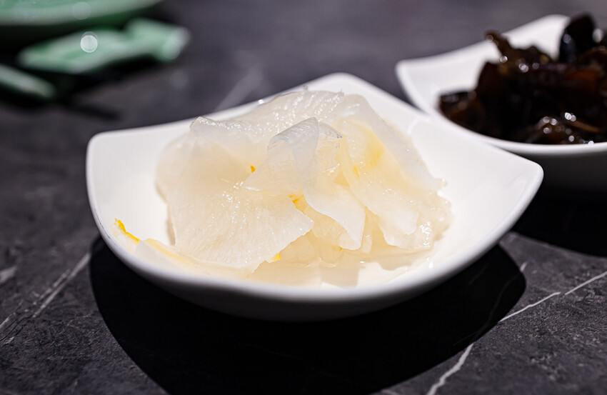 這兩道小菜都是走比較酸香的風味,特別是柚香蘿蔔,蘿蔔並不會太過生味,主要是酸味配上柚子清香,醋溜雲耳則帶點薑香氣。