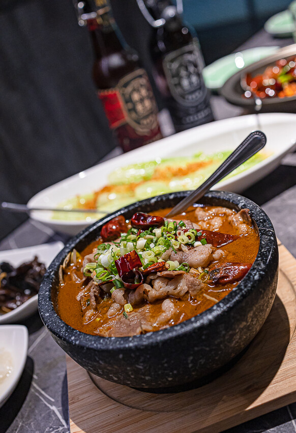 牛肉是使用牛胸腹肉的部位,裡頭滿滿的料有豆芽、豆皮,這些都吸飽了香而不鹹的川味水煮牛肉湯汁,搭配著吃很不賴!