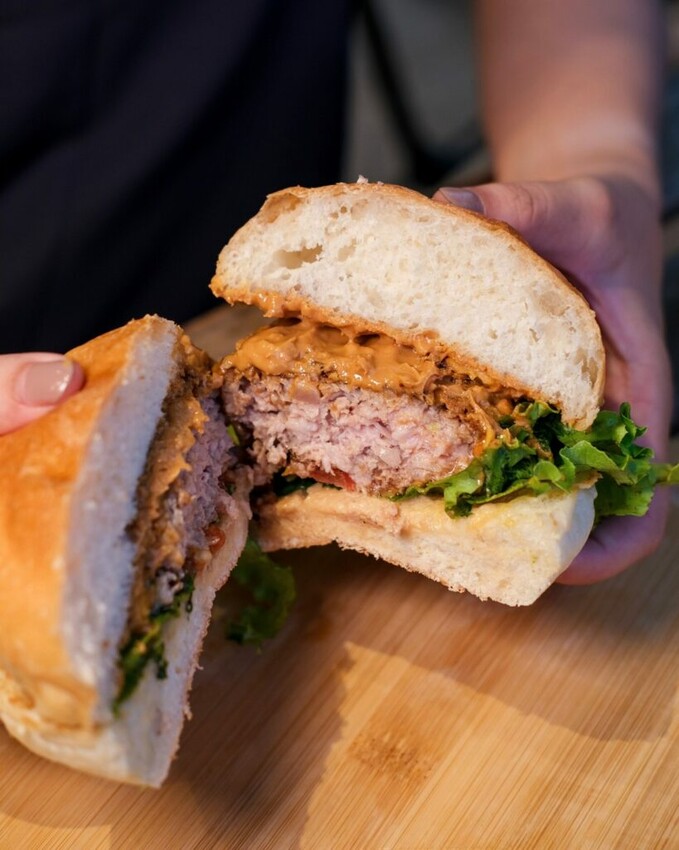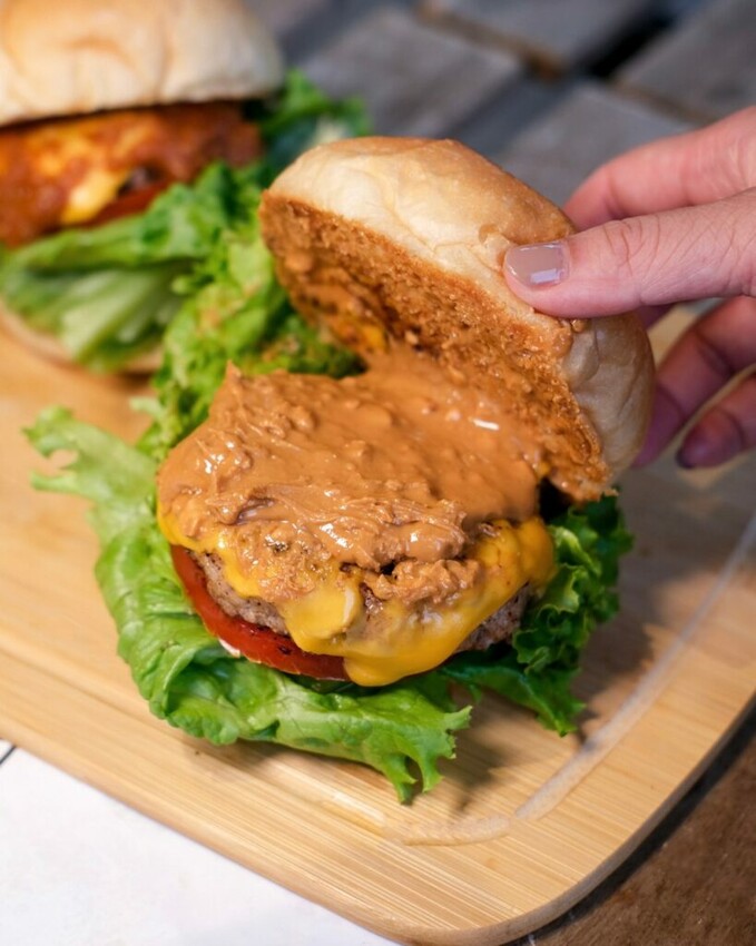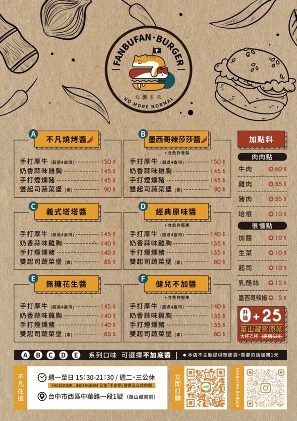 【凡與不凡手作漢堡】以手作漢堡為主打,提供四款主食選項『手打厚牛、奶香蒜味雞胸、手打煙燻豬、雙起司蔬菜』,搭配五款口味『燒烤醬、墨西哥辣莎莎醬、義式塔塔醬、經典原味醬、無糖花生醬』,如果不想加醬也可以客製化調整~