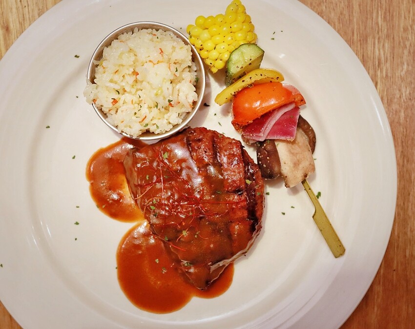 這份是大姑點給公公吃的紅酒醬汁厚切牛排,約8oz,會建議5分熟,但我們先選擇7分熟,口感還是很不錯!