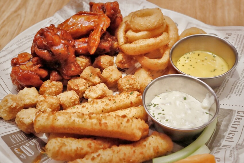 內有雞米花、洋蔥圈、起司條、辣雞翅,醬料有提供兩種(蜂蜜芥末以及塔塔醬),炸物的部分大人小孩都很愛,至於辣雞翅就真的有點辣度,有點偏韓式炸雞的處理方式,吃辣的我們都很喜歡,小孩就有被辣到!
