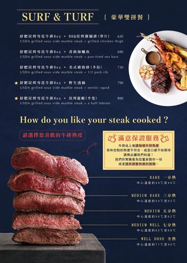 我們點了兩份8oz的雪花牛排來享用,點選排餐會附贈2款配菜(可8選2,有蔬菜串、烤鳳梨、馬鈴薯條、地瓜薯條、薯泥、飯、蒜球、奶油玉米可以選擇),而雪花牛排大多建議5分熟或是7分熟,但想吃全熟的朋友還是可以跟服務人員告知喔!