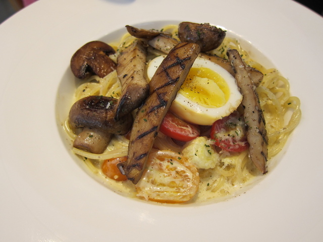 因為有位同事吃素食,所以特地請店家調整的奶油蛋黃麵佐煙燻糖心蛋。少了培根,以烤菇來替代。