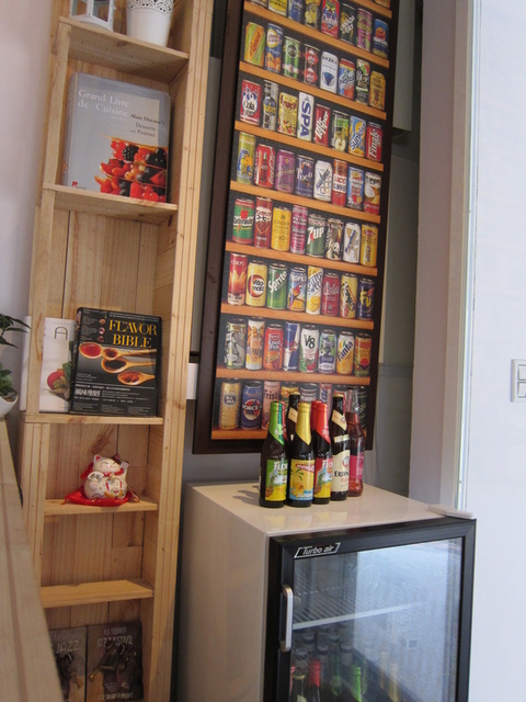 登上幾階小台階後,門口就是一台小冰箱,牆上高掛著一長條的飲料照片,巧妙的與冰箱中飲料相互呼應。