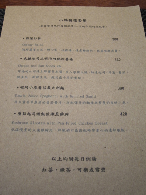 菜單就只有簡單的用幾張牛皮紙列印出來,餐點以單點為主。週二至週五的中午則有提供商業午餐的選擇。個人覺得店內的餐點價格偏高,主餐及商業午餐價格都是從300元起跳。