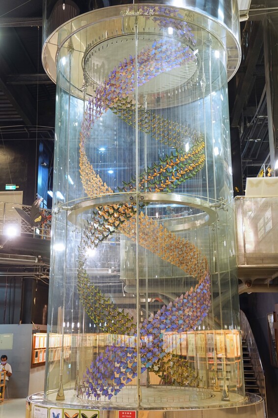 共計千隻蝴蝶在環繞成雙股螺旋,配合基座緩慢網上旋轉