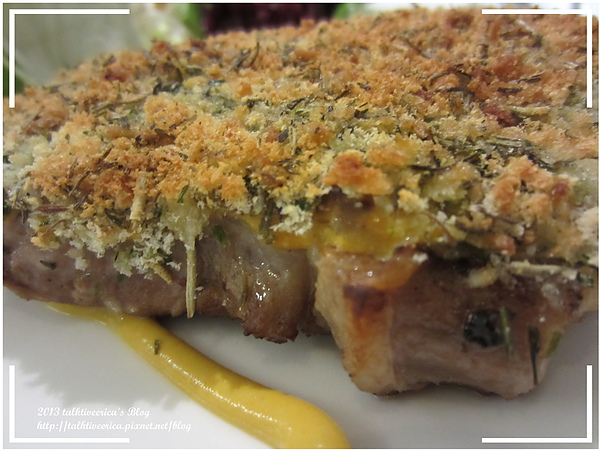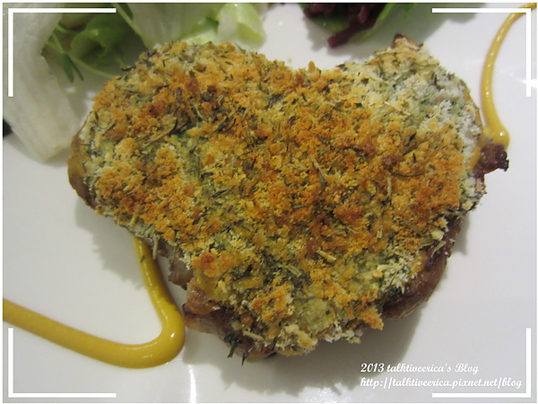 用自製的酥脆的麵包粉與香草結合並覆蓋在豬排上