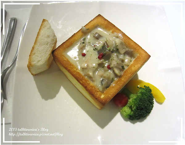 用吐司挖空中間是奶油濃湯,這是棺材板的改良版嗎?哈哈