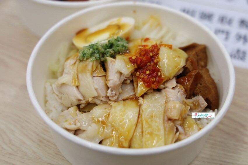 所謂有配菜,就是除了雞及白飯外,另有三種配菜。這天的是淋上醬油的燙高麗菜、半顆白煮蛋,還有淋上甜辣醬的滷油豆腐。